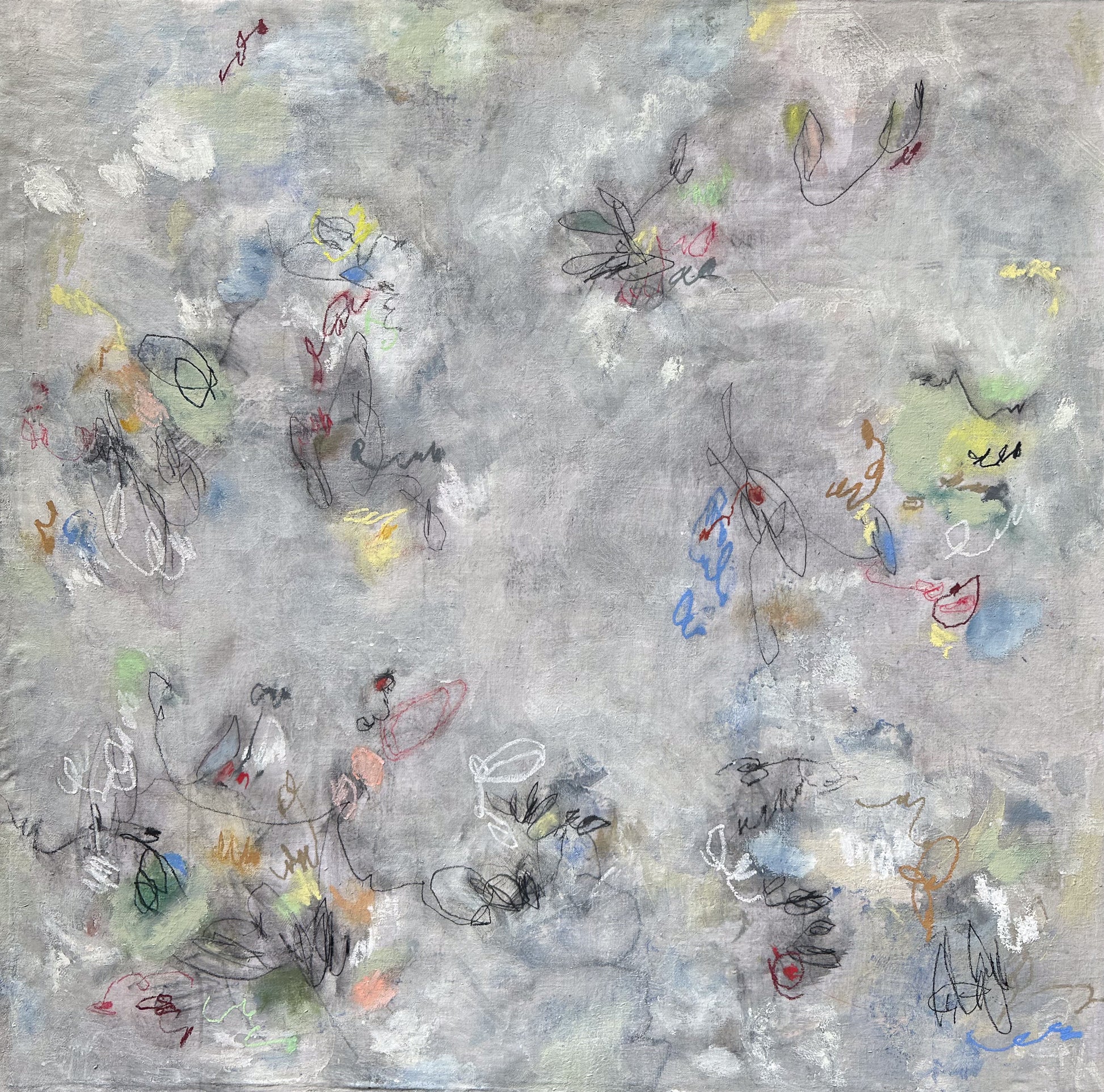 Acrylic, Gouache, Oil Stick, Oil Pastels, Graphite on Antique Textile on Board